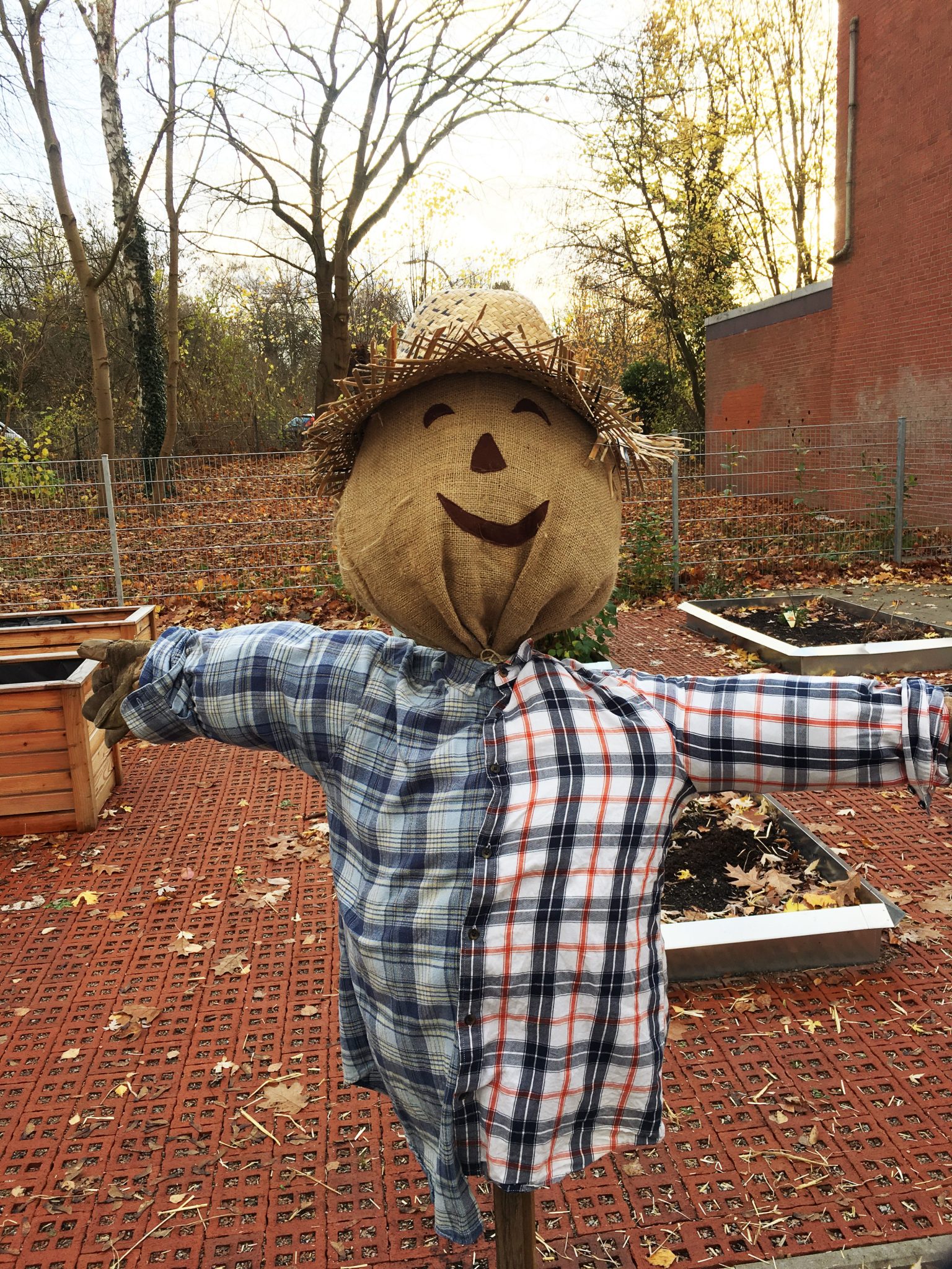 Die Klasse 1c war im Schulgarten. Dort haben die Kinder eine große Vogelscheuche gebaut und Blumenzwiebeln für den Frühling in die Erde gesetzt.