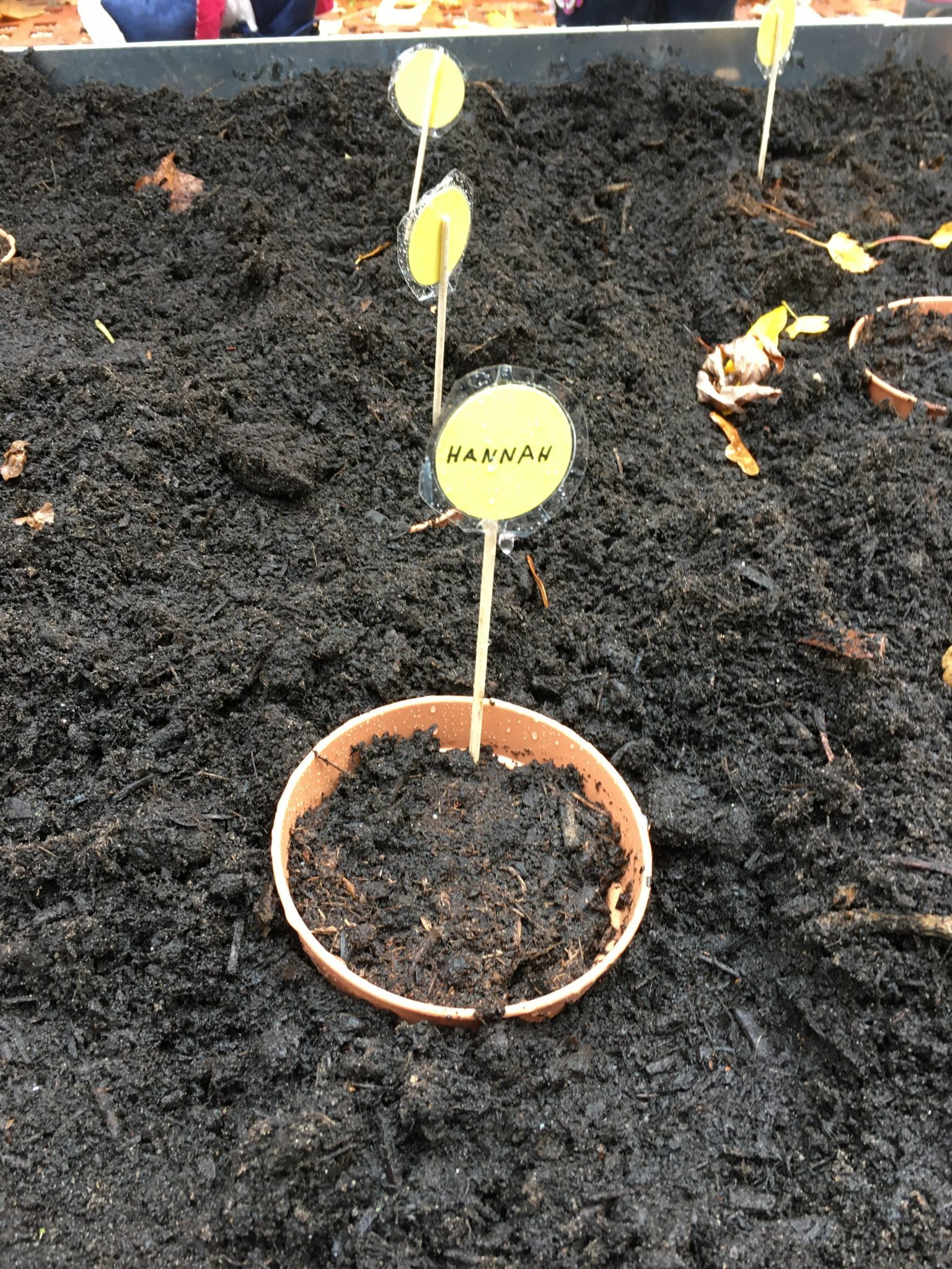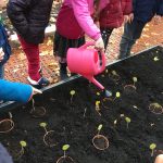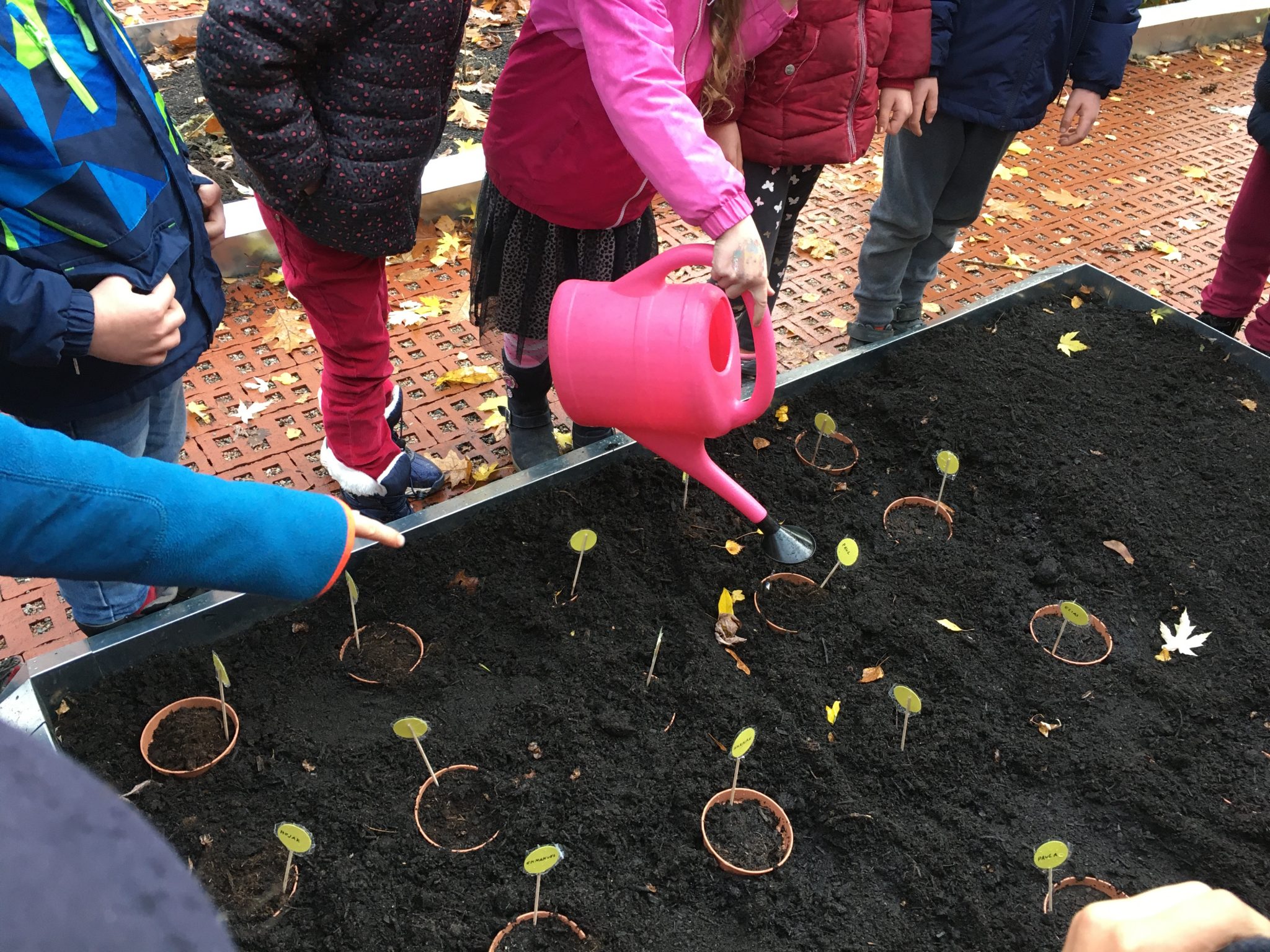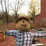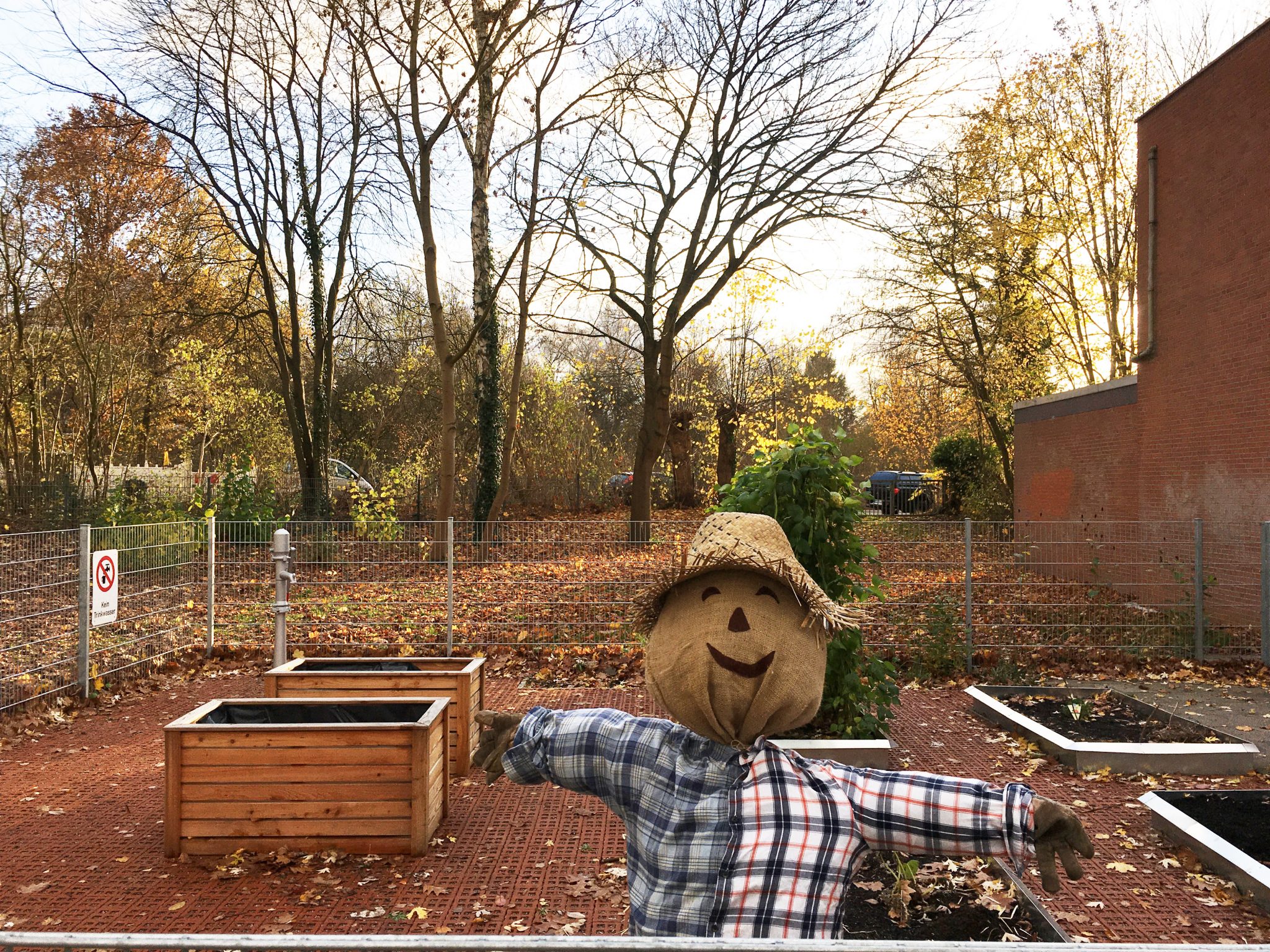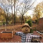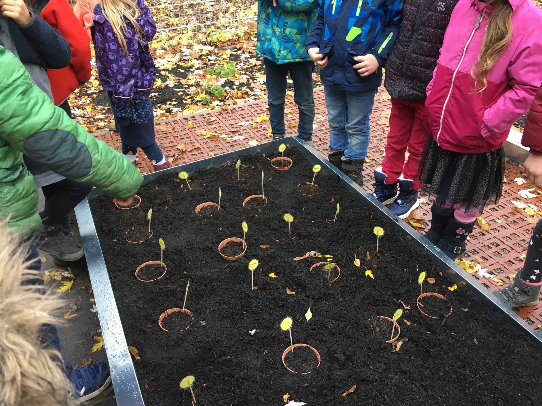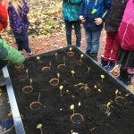 Die Klasse 1c war im Schulgarten. Dort haben die Kinder eine große Vogelscheuche gebaut und Blumenzwiebeln für den Frühling in die Erde gesetzt.