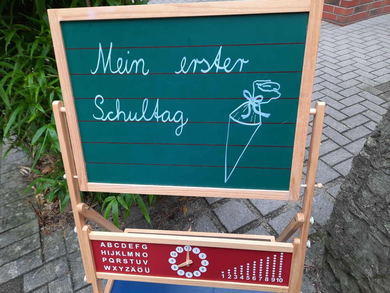 Schick gemacht, großer Schulranzen und eine noch größere Schultüte! So lief am 10. August im 1,5-Stundentakt auf dem Weg vom Haupteingang in Richtung Mehrzweckhalle ein neues Schulkind nach dem nächsten seinem besonderen Tag entgegen. Eine kleine Tafel mit der Aufschrift „Mein  erster Schultag“ führte zumindest den maximal zwei Begleitpersonen pro Kind noch einmal vor Augen, warum sie an diesem besonderen Tag an der Schule Sander Straße waren. Die neuen Erstklässler, die das Lesen ja erst noch lernen werden, suchten sich ihre Plätze in der von Hausmeister Hewig bestens vorbereiteten Mehrzweckhalle mit brandneu vergrößerter Bühne. Toll geschmückt wurde die Halle von den 2. und 4. Klassen. Und auch Frau Lindemann und Frau Martini-Stehr aus dem Schulbüro zeigten wieder einmal ihr Organisationstalent und beschrifteten die Stuhlgruppen mit den ca. 80 Namen in vier Durchgängen. Vier Durchgänge? Pandemiebedingt fanden die Einschulungen klassenweise statt und dieser Jahrgang ist mit den Klassen 1a, 1b, 1c und 1d sogar vierzügig, also viermal so gut.